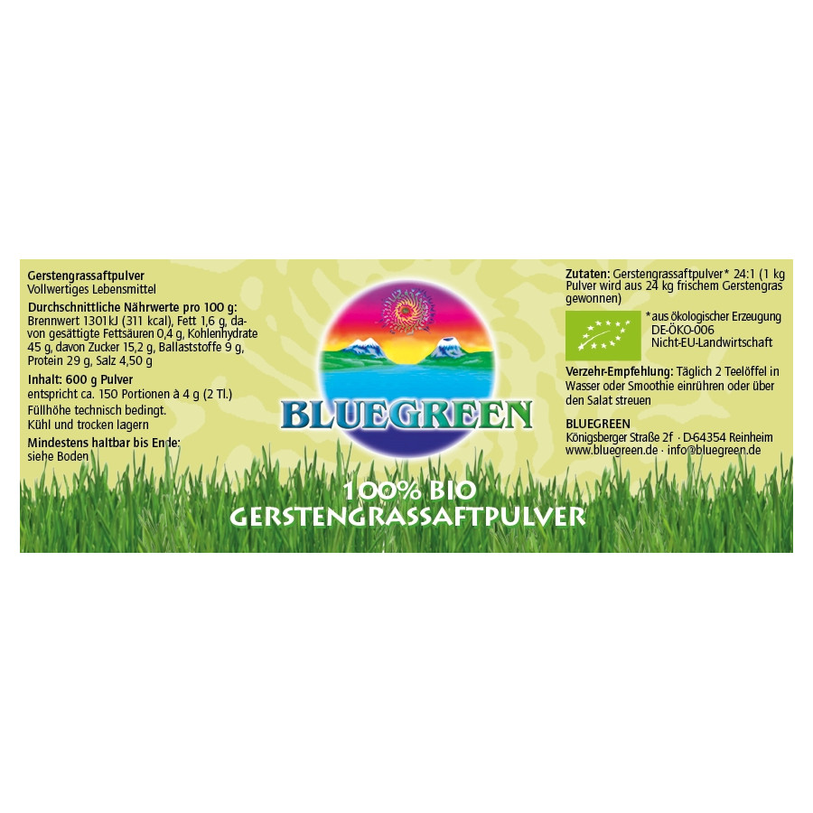 In jeder Altersphase erfrischt es den Geist und gibt Ihnen die Energie, die sonst durch Umweltschadstoffe blockiert wird. Die Vitalstoffe aus 24 kg frischem Bio-Gerstengras finden sich nach der Entsaftung und einer schonenden Trocknung unter 40°C in1 kg feinem tiefgrünen Gerstengrassaftpulver wieder.