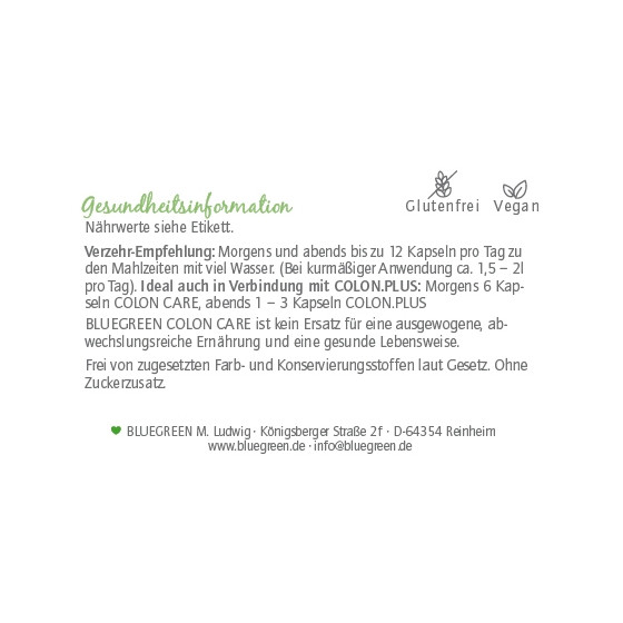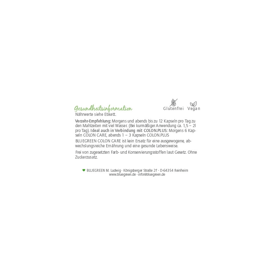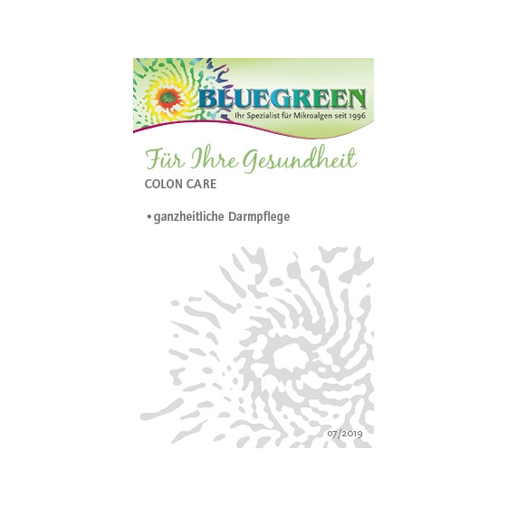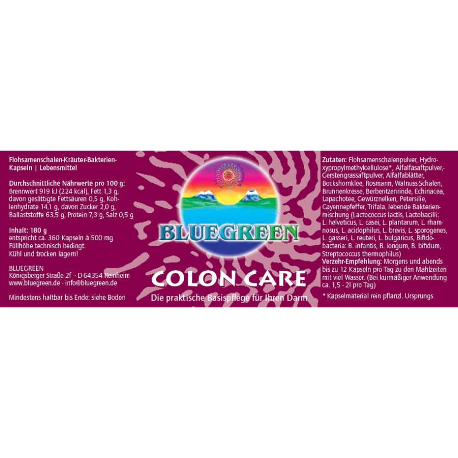 - Für den Darm, für Stoffwechsel und Immunsystem gleichermaßen zuständig, bietet Ihnen BLUEGREEEN mit Colon Care ein Produkt, das umfassend und komfortabel zugleich eine effektive Darmpflege erreicht.