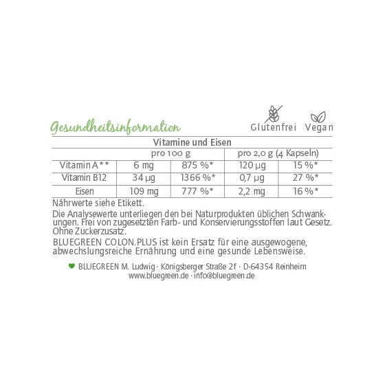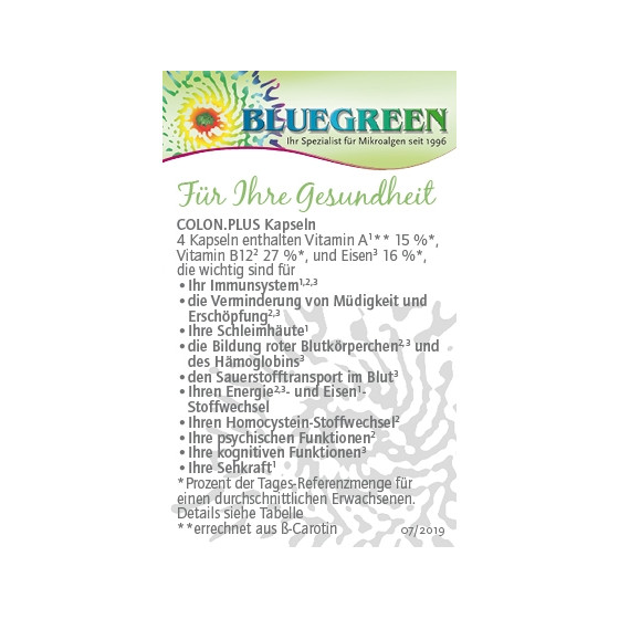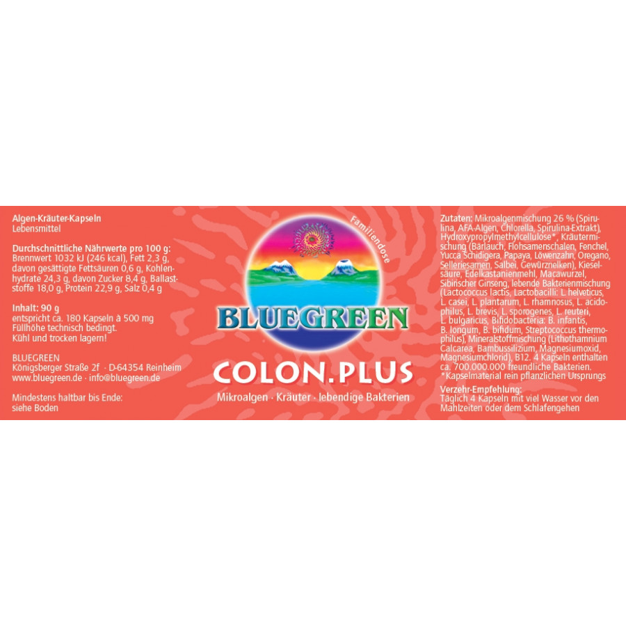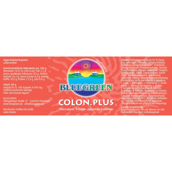 - Neben der Rundumversorgung des ganzen Körpers erreicht BLUEGREEN COLON.PLUS besonders den Dünndarm. Es ist damit die ideale Ergänzung zu BLUEGREEN COLON CARE, das mehr den Dickdarm erreicht.