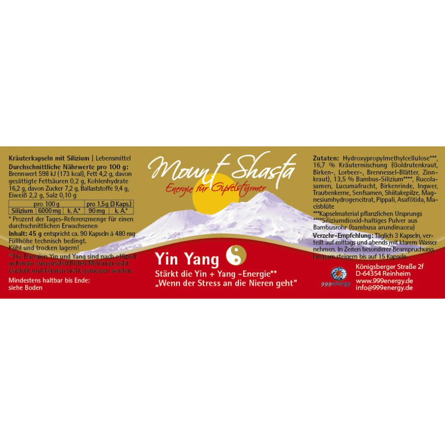 Rucolasamen, Birkenblätter, Brennnessel, Lorbeer und Goldrute fanden den Weg in Mount Shasta Yin Yang . Lucuma, die subtropische Frucht aus Peru, kombiniert mit Gewürzen wie Muskatblüte, Ingwer, Pippali (Langer Pfeffer), Lorbeerblätter und Senf machen die Rezeptur zu einem rundum gelungenen Mittel, das Sie wieder ausbalancieren und damit in Ihre Kraft bringen kann.