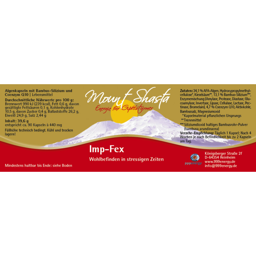 Mount Shasta Imp-Fex kann mit seiner speziellen Mischung aus AFA-Algen, Bambussilizium, Bambussalz, Magnesiumoxid, Aktivkohle, Enzymen und Coenzym Q10 für eine Entlastung des Körpers und damit einhergehend auch für ein besseres Wohlgefühl sorgen.